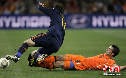 加時賽剛一開場,德容就成功搶斷后將球傳給羅本,羅本一人吸引了三名西班牙隊員防守,最終難以形成突破。第92分鐘西班牙隊員在禁區(qū)前沿制造殺機,伊涅斯塔、法布雷加斯和哈維相繼摔倒,不過主裁判只給了西班牙一個角球。