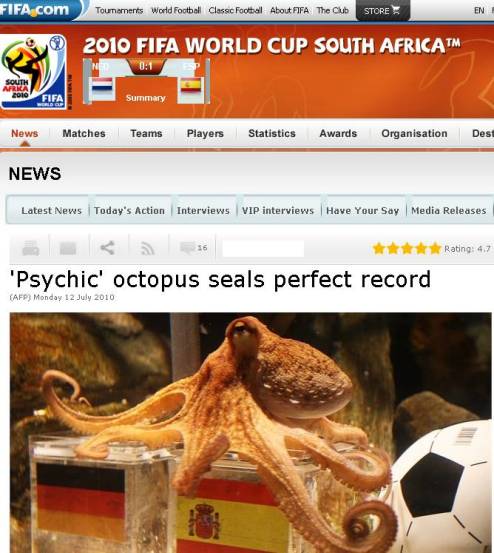 章魚保羅預(yù)測決賽中西班牙將擊敗荷蘭隊(duì)奪冠。雖然比賽被拖到加時的116分鐘,但伊涅斯塔的進(jìn)球還是讓保羅的神奇再次延續(xù),這也是它在本屆世界杯上成功預(yù)測的第8場比賽,而且其預(yù)測成功率為100%!它所預(yù)測的比賽,除了這場決賽,還有德國隊(duì)的全部七場比賽。