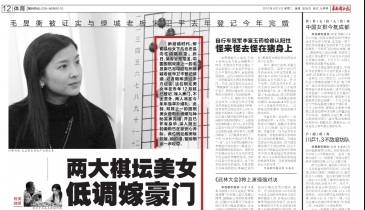 新結(jié)婚時代,即便是仙女下凡也還是向往婚姻殿堂。昨日,某專業(yè)報報道,中國圍棋雙姝之一的毛昱衡已與中超杭州綠城老板宋衛(wèi)平登記結(jié)婚,記者隨即通過多方證實(shí),這位棋壇美女早在去年12月就已登記,嫁入豪門,不出意外,兩人將在今年年底舉辦婚禮。此前,雙姝之一的圍棋美女唐莉也被爆與神秘富豪完婚,并且已懷有身孕,深入簡出的唐莉已在家安心養(yǎng)胎。兩位棋壇最美嫁的嫁,婚的婚,留給棋迷一聲嘆息。