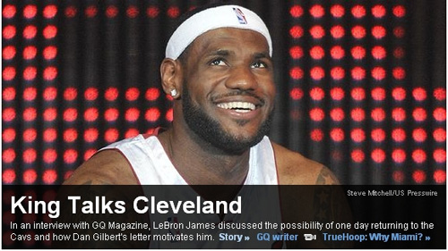 中新網(wǎng)8月18日電 在九月的《GQ》雜志專訪上,“皇帝”詹姆斯首次敞開心扉,談到了他為何會出走至熱火打球,以及未來重返克利夫蘭效力的可能性。
