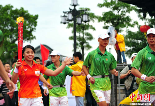 22日的亞運火炬?zhèn)鬟f讓現(xiàn)代文明和古代文化在這里激情交匯。上午9時,火炬?zhèn)鬟f點火儀式在明代閩贛交通要沖廣濟(jì)門城樓前舉行,在具有濃郁潮州特色的潮州醒獅表演后,第一棒火炬手張宛瓊從潮州市委書記駱文智手中接過火炬。