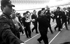前天的慈善午宴,馬拉多納讓英利方面苦苦等待了兩個(gè)小時(shí)。而昨天,等待“球王”的人增加到了一萬多人。按照原計(jì)劃,比賽應(yīng)該在15時(shí)開始。不過,直到15時(shí)55分,全場上萬觀眾才看到穿著黑色運(yùn)動服的馬拉多納出現(xiàn)在主席臺上。在秀了一句“你好”之后,老馬在數(shù)十名保安和工作人員的護(hù)衛(wèi)下,開始繞場一周,問候球迷。