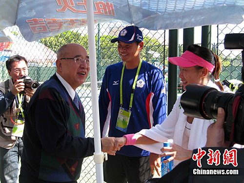 中新網(wǎng)廣州11月13日電 (記者 郭軍)13日上午,廣州亞運(yùn)會(huì)網(wǎng)球女子團(tuán)體賽第一輪中華臺(tái)北隊(duì)對(duì)越南隊(duì)的比賽在奧體網(wǎng)球中心四號(hào)場(chǎng)舉行。中國國民黨榮譽(yù)主席吳伯雄來到賽場(chǎng)外為寶島選手加油鼓勁。