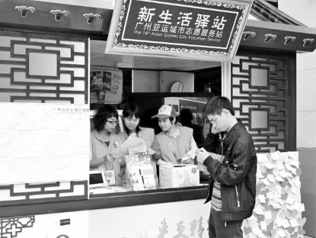 昨天下午當(dāng)班的黃洪丹,是廣東交通職業(yè)學(xué)院的大二學(xué)生,也是同行8人的班長(zhǎng)。她為記者一一介紹了站內(nèi)各種方便設(shè)施,告訴記者今天短短幾個(gè)小時(shí),她們已經(jīng)接待了100多位前來(lái)咨詢(xún)的朋友,“就是剛才,我們剛給一大幫外國(guó)朋友指了去亞運(yùn)村的路呢!