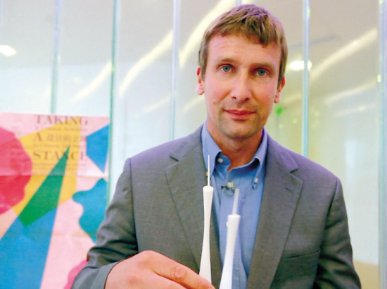 11月14日晚,廣州新電視塔頂層,在這個(gè)尚未開(kāi)放的區(qū)域,這座“小蠻腰”的設(shè)計(jì)師馬克(MARK HEMEL,見(jiàn)上圖)接受了羊城晚報(bào)記者專(zhuān)訪(fǎng)。馬克的記憶,還停留在亞運(yùn)開(kāi)幕式那晚電視塔璀璨奪目的那刻,他既驚嘆又感慨,連連稱(chēng):“‘女兒’終于出閣了!”