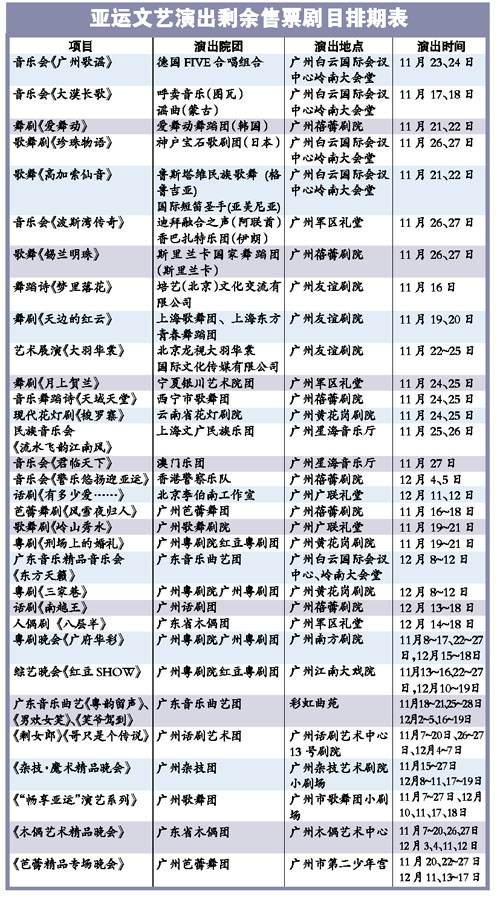 第16屆廣州亞運(yùn)會(huì)已經(jīng)進(jìn)入第4個(gè)比賽日,亞運(yùn)文藝好戲也正在上演,之前的演出幾乎是場場爆滿。據(jù)了解,亞運(yùn)文藝演出還有少量余票可售,感興趣的是市民可千萬不能錯(cuò)過。觀眾可以撥打總票房電話020-83567425、83566719進(jìn)行咨詢和訂票,也可以登錄在網(wǎng)上訂票。
