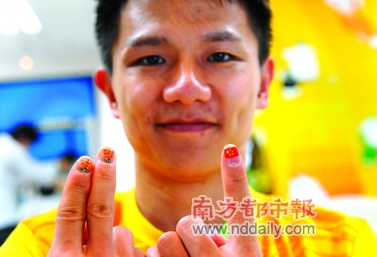 14日中午,記者在運(yùn)動員村國際區(qū)采訪時(shí)偶遇了陳一冰。剛吃完午飯的他,徑直走進(jìn)了位于國際區(qū)A區(qū)一樓的美發(fā)室。美甲師陳琳告訴記者,陳一冰的左右手食指上原本就涂了圖案,左手是五星國旗,右手是個(gè)“冰”字,下面還加了個(gè)“No.1”。