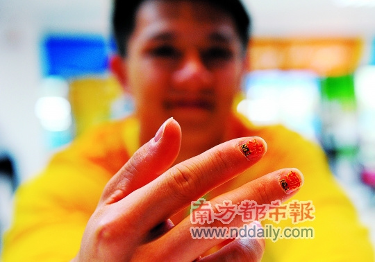 在陳琳將陳一冰指甲上的國旗和“冰”字稍作修補(bǔ)后,“他對我說,能不能再給我設(shè)計(jì)一個(gè)娜字,和這個(gè)冰一樣,涂在右手中指指甲上,說的時(shí)候還有點(diǎn)靦腆,但我一下子就明白了,就照這在他的指甲上圖上了一個(gè)大紅的‘娜’字。”陳琳說。