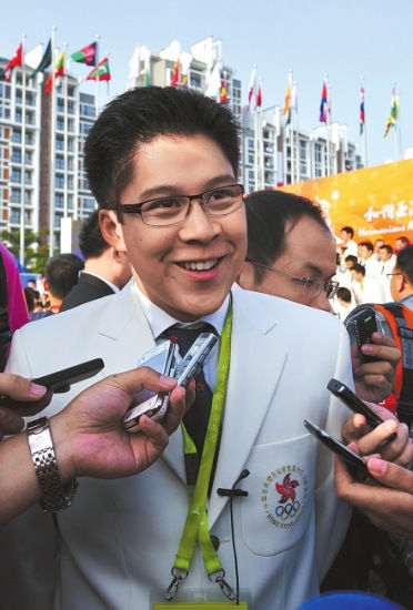 升旗儀式結(jié)束后,霍啟剛便和香港代表團(tuán)的運(yùn)動(dòng)員們簇?fù)碓谝黄鸷嫌傲裟,作為代表團(tuán)副團(tuán)長(zhǎng)的他,自然沒(méi)有忘記自己的身份!斑@一次你會(huì)去看跳水嗎?”當(dāng)華西都市報(bào)記者將這個(gè)問(wèn)題拋給霍啟剛時(shí),他笑了一笑:“我就知道你要問(wèn)我這個(gè)問(wèn)題,在香港我就一直被問(wèn)這個(gè)問(wèn)題,到這里來(lái)還是被問(wèn)這個(gè)問(wèn)題,哈哈!被魡偟钠胀ㄔ挿浅(biāo)準(zhǔn),周圍的香港媒體聽(tīng)到了霍啟剛這樣回答,也都笑了起來(lái)。