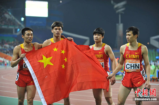 中新網(wǎng)11月26日電 在26日晚結(jié)束的廣州亞運(yùn)會(huì)田徑男子4x100米接力決賽中,新科亞洲“百米王”勞義與陸斌、梁嘉鴻和蘇炳添組成的中國(guó)隊(duì)以38秒78的歷史最好成績(jī)奪得冠軍,20年之后再次奪得亞運(yùn)會(huì)接力冠軍。