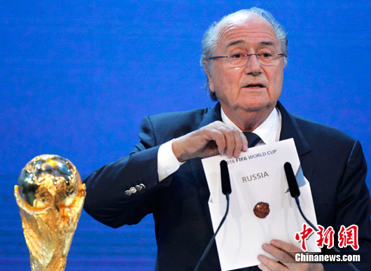 中新網12月3日電 綜合報道 北京時間12月2日23時38分(當地時間16時38分),2018年與2022年世界杯申辦投票結果在瑞士蘇黎世會展中心揭曉。國際足聯主席布拉特宣布:俄羅斯獲得2018年世界杯主辦權,卡塔爾獲得2022年世界杯主辦權。