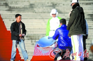 昨天的北京一掃前日的大霧氣,天高云淡,寒風(fēng)凜冽。在世紀(jì)壇靠近頂端的臺(tái)階上,搭建了一個(gè)紅色的采火臺(tái)。17名少女身著白色的羽絨衣,列隊(duì)演練,不斷熟練地跟隨采火使者緩緩步下臺(tái)階的節(jié)奏和路線。看起來(lái),她們中不止一人來(lái)自新疆。但只有一名長(zhǎng)發(fā)女子一直在周嘉威周?chē),反?fù)演練采火的動(dòng)作與行進(jìn)的路線。