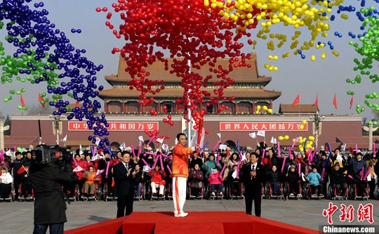 中新網(wǎng)北京12月4日電 2010年廣州亞洲殘疾人運動會火炬點燃暨火炬?zhèn)鬟f活動啟動儀式,今日上午在北京人民大會堂北大廳舉行。中共中央政治局常委、國家副主席習近平在啟動儀式上點燃主火炬,并宣布火炬?zhèn)鬟f活動開始。