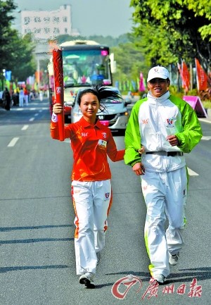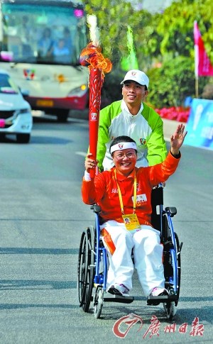 昨日上午,廣州2010年亞洲殘疾人運(yùn)動(dòng)會(huì)廣州火炬?zhèn)鬟f活動(dòng)在花城廣場(chǎng)拉開帷幕,8.8公里的路途上,共有98名火炬手參與傳遞活動(dòng),包括21名殘疾人士。他們中既有杰出的殘疾運(yùn)動(dòng)員,也有各行各業(yè)的優(yōu)秀殘疾人代表,還有默默耕耘的志愿者和廣州亞運(yùn)會(huì)中奪冠的體育健兒,做出積極貢獻(xiàn)的各方面人士。