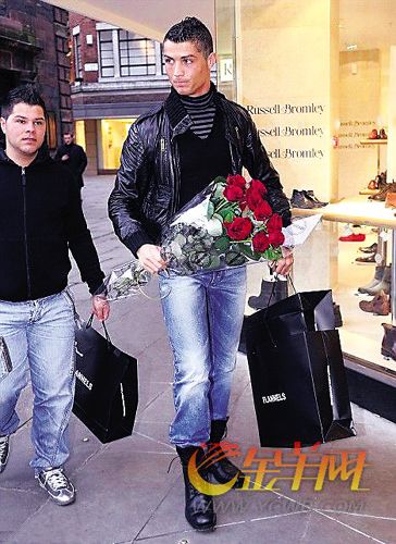 24歲的曼聯(lián)球星當(dāng)天攜一名友人一起出行,他們在曼徹斯特一家高級商店花了1萬英鎊,買走了幾套休閑服裝。真可謂一擲千金。而當(dāng)天還有C·羅的球迷發(fā)現(xiàn)了他們,興奮的球迷送給了C·羅一束火紅的玫瑰。手持玫瑰的C·羅看上去更加娘娘腔了。