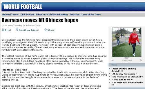 國(guó)際足聯(lián)官方網(wǎng)站昨天以《海外球員重燃中國(guó)足球希望》為題,對(duì)中國(guó)足壇新一代“留洋潮”進(jìn)行了報(bào)道。文章稱,自國(guó)足無(wú)緣南非世界杯之后,中國(guó)球迷們承受了巨大的失望。他們自嘲是“世界上最好的球迷”,但沒有匹配的球隊(duì)。然而,隨著幾名球員最近再度走出國(guó)門,中國(guó)球迷們的熱情再度被調(diào)動(dòng)。