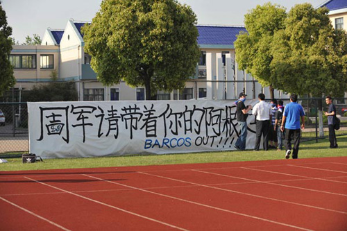 據(jù)現(xiàn)場目擊記者透露,該橫幅上的周字是經(jīng)過球迷改造的,周字中間的口部當(dāng)中出現(xiàn)了兩個(gè)代表美元的符號(hào)。據(jù)記者了解,之所以球迷將周軍的周字中間部分做成美元標(biāo)識(shí),是因?yàn)橛蟹婚g傳聞申花的五千萬水貨外援讓其腰包鼓鼓。而橫幅還出現(xiàn)了巴爾克斯的名字,巴爾克斯在申花客場對(duì)新加波一戰(zhàn)中雖然攻進(jìn)一球,但是錯(cuò)失多次必進(jìn)球機(jī)會(huì),被認(rèn)為是申花亞冠出局的最大罪人之一,而他恰好是周軍找來的外援。