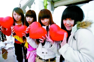 2月14日,山東濟(jì)南,CBA山東黃金俱樂部的4名單身籃球?qū)氊惢ハ噘?zèng)送禮品,共度情人節(jié)。