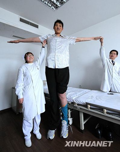趙亮的身高比籃球明星、“小巨人”姚明高20厘米,比入選吉尼斯的世界第一高人鮑喜順高10厘米。