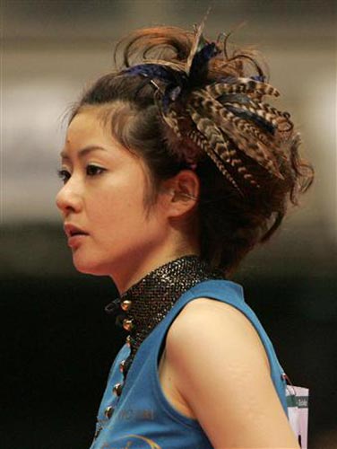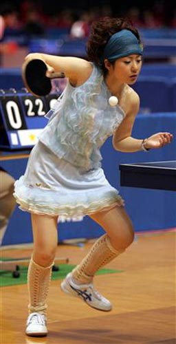 在日本乒壇,福原愛名聲最大,其次就是有著漂亮臉蛋、性感身材的四元奈生美了。今年30歲的四元在日本的影響并不比福原愛低多少。從2007年的全日本乒乓球錦標(biāo)賽至今,這位美女球員每次比賽都會(huì)換上不同的時(shí)尚超短裙,或是露出香肩的吊帶衫參賽。而且,她的頭飾也都是經(jīng)過發(fā)型師精心設(shè)計(jì)的,爆炸式、淑女式……總之,五顏六色的服裝+各類怪異的發(fā)型+比賽場(chǎng)上揮拍動(dòng)作都是那么的迷人,相比于其他運(yùn)動(dòng)員的一臉嚴(yán)肅,四元奈生美在賽場(chǎng)上刮起的時(shí)尚之風(fēng)迷倒了很多日本男球迷。