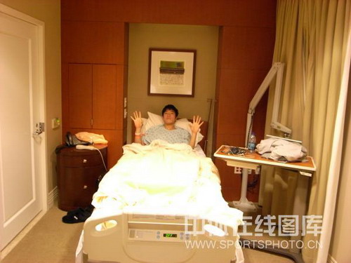 圖為術后的劉翔在病床上上開雙手祝賀手術成功。(本組圖片來源:華奧星空)