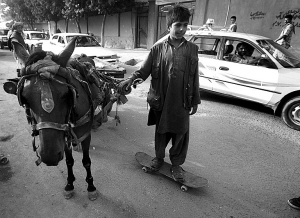 六個(gè)孩子在街頭公園里玩滑板,翻著跟頭,不停地笑著,看起來(lái)和世界任何一個(gè)城市的孩子一樣,但這里是喀布爾,阿富汗。就在離他們二十幾米以外,有輛被炸毀的汽車還躺在一攤刺眼的血跡旁,一個(gè)多小時(shí)前,這里剛剛發(fā)生了一起汽車炸彈爆炸事件。