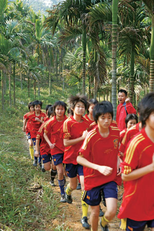 再往里走,便看見了一群十五六歲的女孩。她們穿著統(tǒng)一的紅色運(yùn)動衣,在坑洼不平的操場上奔跑著,身旁跟隨著她們的教練肖山,剛才那個沙啞的聲音就是他喊的!敖裉煊(xùn)練表現(xiàn)最好的隊(duì)員,一會兒才有雞腿吃!”肖教練說。
