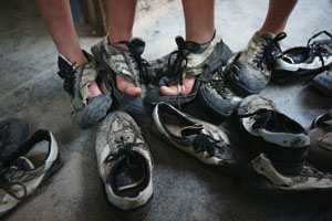 最讓大伙頭疼的還是球鞋。瓊中雨水多,球鞋很容易壞,有時(shí)兩個(gè)星期就能穿壞一雙。一開始谷教練還把隊(duì)員的鞋拿出去補(bǔ),后來為了省錢索性買回工具和線讓姑娘們自己補(bǔ)。
