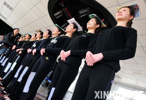 3月25日,曾擔(dān)任北京奧運會禮儀志愿者培訓(xùn)老師的王迅(左一)在對志愿者進行形體指導(dǎo)。