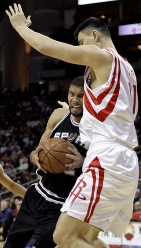 雖然說火箭最終輸掉了比賽,但是我們卻在比賽中欣喜的看到了一件事情,那就是,姚明在面對自己的老對手鄧肯的時候,終于扭轉了自己一貫以來的頹勢。其實在NBA中一直就有這么一種說法,鄧肯在場上怕奧尼爾,奧尼爾怕姚明,而姚明則怕鄧肯,三人之間形成了一個循環(huán)套。,但是,今天姚明的表現,卻接開了這個循環(huán)套中打得最死的一個結。