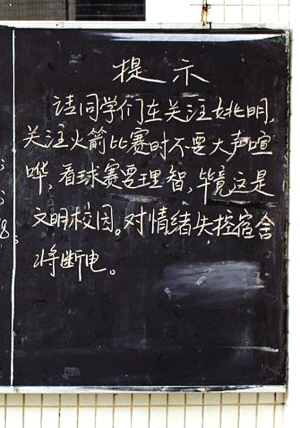在廣州某大學(xué),為限制學(xué)生狂熱的心情,宿管處黑板上出現(xiàn)了一個奇怪的布告:請同學(xué)們在關(guān)注姚明、關(guān)注火箭比賽時不要大聲喧嘩,看球賽要理智,畢竟這是文明校園。對情緒失控的宿舍將斷電。