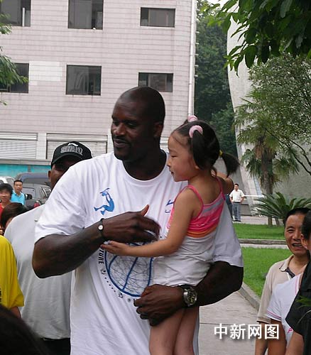 奧尼爾一下車,就受到孩子們的擁戴,現(xiàn)場(chǎng)一片歡呼聲和歡迎聲。已經(jīng)有了三個(gè)孩子的奧尼爾,興奮地抱起給他獻(xiàn)花的一位七歲小女孩,親了親她的臉頰。在人們的簇?fù)硐,奧尼爾參觀了汶川地震發(fā)生后修建的板房以及新校舍,詳細(xì)了解災(zāi)后孩子們的學(xué)習(xí)生活狀況。