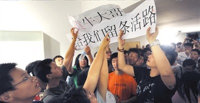 昨天上午11點,300余名國安球迷涌入國安足球俱樂部內(nèi)短短二三十米長的通道,他們高舉著“黃牛大哥,給我們留條活路”的標語,情緒十分激動,抗議“黃!眽艛嚅T票,要求俱樂部保障球迷的利益。由于人數(shù)眾多,現(xiàn)場的暖氣片也被球迷擠壞,暖氣管道里的水灑了一地,廢棄的飲料瓶等雜物也隨處可見。陸續(xù)有數(shù)名民警趕到現(xiàn)場維持秩序,防止球迷出現(xiàn)過激行為。