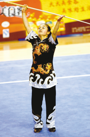 昨天上午,在濱州奧體公園體育館舉行的女子棍術(shù)比賽,代表重慶參賽的17歲小將袁夢(mèng)潔一出場(chǎng)就吸引了觀眾的目光,“這套服裝不錯(cuò),挺好看的!”袁夢(mèng)潔穿的一件鑲有亮片的金色服裝,中間腰帶緊收,下裝則是黑褲但在腳邊又有金色的花型,在整個(gè)體育場(chǎng)燈光的照耀下,特別搶眼。