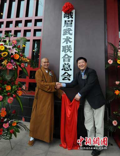 中新網(wǎng)成都5月13日電(林立)13日下午,峨眉武術(shù)聯(lián)合總會(huì)掛牌暨峨眉武術(shù)養(yǎng)生健身館開館儀式在峨眉山大佛禪院內(nèi)隆重舉行。國家體育總局武術(shù)運(yùn)動(dòng)管理中心黨委書記、中國武術(shù)協(xié)會(huì)副主席何青龍,中國佛教協(xié)會(huì)副會(huì)長(zhǎng)、峨眉山佛教協(xié)會(huì)會(huì)長(zhǎng)、峨眉武術(shù)聯(lián)合總會(huì)名譽(yù)會(huì)長(zhǎng)釋永壽為峨眉武術(shù)聯(lián)合總會(huì)及峨眉武術(shù)養(yǎng)生健身館揭牌剪彩。李連杰恩師吳彬等武術(shù)名家受聘為名譽(yù)顧問。