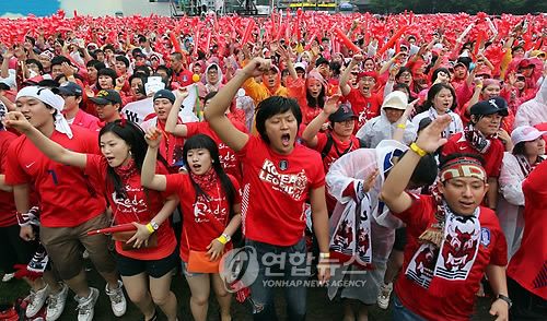 在韓國國內(nèi),熱情的韓國球迷也早早走上街頭,準備為太極虎助威。警方稱,全國街頭助威地點共有280多處,預計會有178.6550萬名球迷為遠征南非的太極虎助威。在首爾市,規(guī)模最大的助威場地要數(shù)首爾廣場,預計會云集25萬名球迷。盡管今天該國普降大雨,廣場卻已站滿了人,甚至有熱心球迷早上7點就來占位。
