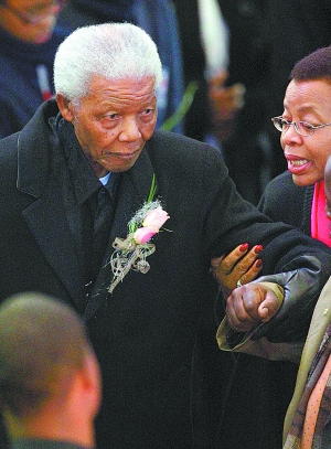 澤娜妮是在世界杯開幕前夜不幸遇難的,91歲高齡的曼德拉也因此取消了出席開幕式的計(jì)劃。上午8時(shí),悼念儀式在學(xué)校禮堂舉行。熱愛音樂的澤娜妮生前是該校唱詩班和樂隊(duì)的成員,幾乎每個(gè)人都喜歡這位性格開朗、活潑的小女孩。儀式以一首悼念歌曲開始,緊接著播放了一組幻燈片,由澤娜妮與曼德拉開心擁抱的合影組成。隨后,幾位親屬代表上前致悼詞。老曼德拉也在親人的陪伴下,步履蹣跚地來到儀式現(xiàn)場,他的衣襟上別著一小簇粉紅色的花束,始終坐在前排,神情十分哀傷。