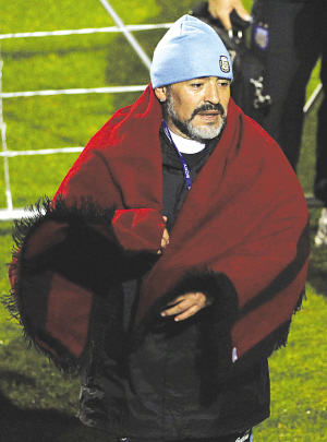 當(dāng)阿根廷隊(duì)剛剛結(jié)束訓(xùn)練,馬拉多納一行正要返回更衣室,這時兩個來自薩爾塔市(布宜諾斯艾利斯以北的小城)的阿根廷記者走了過來向老馬講述了他們長途跋涉帶來禮物和祝福的故事,馬拉多納本來是快步走向更衣室的,聽到記者的故事立刻停了下來!斑@是來自San Antonio de Los Cobres,一個海拔4000米小城孩子們的禮物,他們托我們?yōu)槟銕砹颂鹤。”聽到這里馬拉多納的真性情顯露無遺,接過毯子立刻披在了身上。這個被提到的小城叫做 San Antonio de los Cobres,距薩爾塔市約180公里,距布宜諾斯艾利斯約1750公里,海拔高達(dá)4000米,那里的球迷無法通過電視來觀看世界杯的比賽,但是他們一樣喜歡馬拉多納,關(guān)注阿根廷隊(duì)。許凱 黃啟元 本報(bào)南非專電