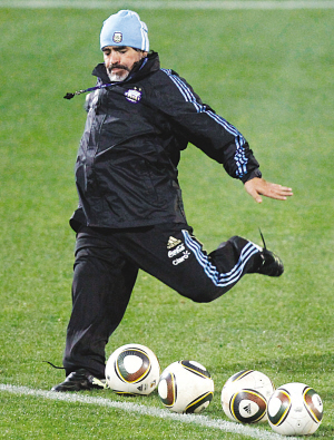 300名記者,上百支“長槍短炮”,密密麻麻擠滿了訓(xùn)練球場的看臺。沒有梅西、伊瓜因,阿根廷人的訓(xùn)練并不寂寞。只因?yàn)橐粋人的存在,馬拉多納。沒有任何懸念,所有的風(fēng)頭,都被老馬一人搶光。