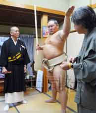 下午4點(diǎn)半過后,來到工作室的朝青龍笑著說:“這是第一次,所以很緊張。我會(huì)努力的!背帻埾瞪习咨鄵溲鼛В沂殖謱毎,左手抬起,擺出憤怒的表情,拍下了照片。