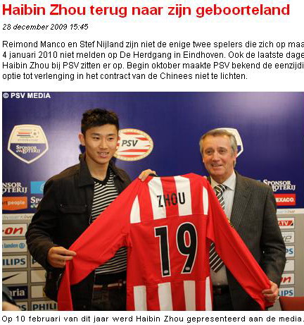 周海濱是今年2月份正式登陸PSV,并在2月17日的一場預(yù)備隊(duì)比賽中登場。雖然未能和周海濱續(xù)約,但PSV官網(wǎng)上還是對其贊賞有佳:“周海濱是PSV歷史上第二名中國球員,首位中過球員是孫祥,他也是第一個在歐冠賽場上登場的中國人。雖然周海濱沒有獲得這也的機(jī)會,但他仍然創(chuàng)造了一個記錄——他是第一個在PSV一線隊(duì)進(jìn)球的中國球員,不過很遺憾他沒有代表PSV參加過正式比賽。”
