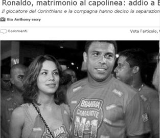 人們普遍媒兩人的情感危機(jī)還是出在“花心大蘿卜”羅納爾多身上,安東妮已經(jīng)實在無法忍受 “外星人”的頻繁出軌。羅納爾多的前幾次分手情況也和這次類似,1999年羅納爾多與米蘭妮在香港結(jié)識,同年的平安夜正式結(jié)婚,并育有一子,但羅納爾多多次的緋聞事件令兩人離婚;2005年2月羅納爾多與巴西女主播兼模特茜卡蕾莉在一個古堡中舉行了聲勢浩大的訂婚晚會,但是隨著茜卡蕾莉在羅納爾多車子的后座發(fā)現(xiàn)避孕套,兩人的婚禮被取消。