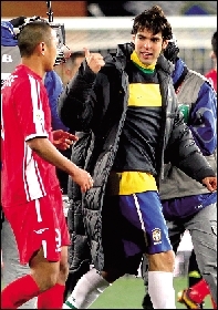 賽前大屏幕用視頻方式公布各隊(duì)首發(fā)名單,卡卡出現(xiàn)時(shí),引發(fā)了全場最響亮掌聲和尖叫聲。當(dāng)卡卡踏上球場,球迷的呼喊聲也是最大的。但比賽中的卡卡讓球迷失望了?ǹ看文们蛏磉吙倳(huì)有3名球員包夾。帶球被搶斷、傳球不到位、多次被撞翻,甚至帶球急停時(shí)摔跤。很顯然,卡卡的身體狀態(tài)非常糟糕。第80分鐘,卡卡被換下。賽后,心煩的卡卡甚至拒絕了鄭大世交換球衣的要求。