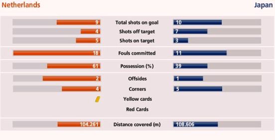 荷蘭隊(duì)全場(chǎng)比賽有9腳射門(mén),5次射中門(mén)框范圍內(nèi),其中包括一個(gè)進(jìn)球和兩次被日本隊(duì)門(mén)將川島永嗣化解的必進(jìn)球機(jī)會(huì)。日本隊(duì)有10腳射門(mén),3腳射中門(mén)框范圍,其中最后階段的一次射門(mén)險(xiǎn)些將比分追平。日本隊(duì)的角球同樣多于荷蘭隊(duì),5次角球,比荷蘭隊(duì)多了一個(gè)。