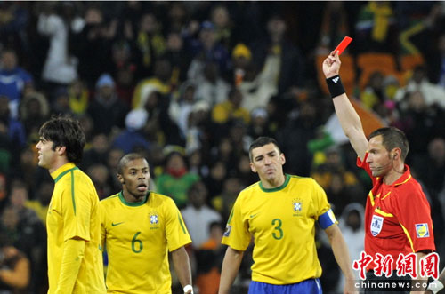 中新網(wǎng)6月21日電 在今天凌晨進(jìn)行的一場世界杯小組賽中,巴西隊在約翰內(nèi)斯堡足球城球場迎來了第二個對手科特迪瓦。最終憑借法比亞諾梅開二度和埃拉諾的進(jìn)球,巴西3-1擊敗科特迪瓦。而在比賽進(jìn)行到第88分鐘時,卡卡因肘擊對方球員,累計兩張黃牌被罰下場。