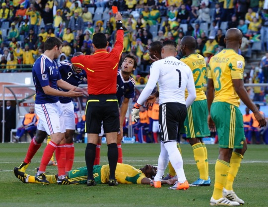 也許失球只是法國隊(duì)噩夢(mèng)的開始,比賽進(jìn)行到第25分鐘,法國隊(duì)攻入南非隊(duì)禁區(qū),中場球員、有著“齊達(dá)內(nèi)接班人”之稱的古爾庫夫在爭頂頭球時(shí)肘部擊中了對(duì)手,南非隊(duì)隊(duì)員就勢倒地不起做昏厥狀。主裁判果斷出示紅牌,將古爾庫夫罰下。