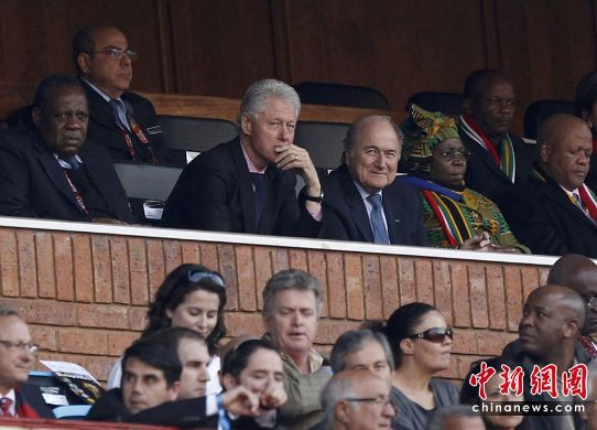 中新網(wǎng)6月24日電 23日晚,美國隊(duì)?wèi){借著補(bǔ)時(shí)階段多諾萬的進(jìn)球,在世界杯C組的最后一輪的比賽中力克阿爾及利亞隊(duì),獲得小組第一名,成功晉級(jí)16強(qiáng)。比賽中,美國前總統(tǒng)克林頓在看臺(tái)上和國際足聯(lián)主席布拉特一起觀看了比賽。賽后,他出現(xiàn)在了美國隊(duì)的更衣室,大贊隊(duì)員們在比賽中弘揚(yáng)了美國精神。