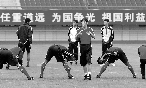昨日上海驟然降溫,淅淅瀝瀝的小雨悄然而至,國(guó)家隊(duì)下午5時(shí)出現(xiàn)在訓(xùn)練場(chǎng)上,金山體育中心為國(guó)足打出“任重道遠(yuǎn)、為國(guó)爭(zhēng)光、祖國(guó)利益高于一切”的橫幅。主帥高洪波身穿紅衣短袖,而助理教練傅博、區(qū)楚良則身穿白底的運(yùn)動(dòng)外套,在國(guó)家隊(duì)隊(duì)員的包圍中,甚至很難辨別出少帥之身份。國(guó)安隊(duì)及山東隊(duì)的6名隊(duì)員由于航班原因遲到,因此首堂訓(xùn)練課由25名隊(duì)員參與。由于國(guó)足隊(duì)員上周末剛打完職業(yè)聯(lián)賽,因此首堂訓(xùn)練課主要以恢復(fù)性訓(xùn)練為主。訓(xùn)練內(nèi)容從慢跑開始,隊(duì)員們并沒有成群結(jié)隊(duì)一同跑,而是三三兩兩地分開慢跑,鄭智、王新欣與周海濱分成一組,慢跑中隊(duì)員不時(shí)聊天談笑,氣氛顯得十分輕松,絲毫不覺聯(lián)賽過后的疲憊。隨后在傅博的帶領(lǐng)下,隊(duì)員分成三組進(jìn)行搶圈訓(xùn)練,高洪波則在一旁當(dāng)“監(jiān)工”。在訓(xùn)練尾聲,以高洪波領(lǐng)銜的教練組與國(guó)足一同慢跑,此次慢跑持續(xù)了超過20分鐘。一個(gè)半小時(shí)的訓(xùn)練結(jié)束后,山東魯能的4名隊(duì)員韓鵬、王永珀、吳昊及劉金東才姍姍來遲,此時(shí)助教傅博氣喘噓噓地喊隊(duì)醫(yī)尹煜華說:“拿著表,盯著他們跑20分鐘啊!币蠓蛑缓迷谟曛小蔼(dú)訓(xùn)”國(guó)腳。