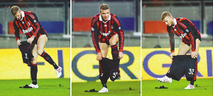 不知是不是太過賣力,動作幅度太大,貝克漢姆的球褲在比賽中竟然撕裂了。向裁判申請后,米蘭隊工作人員將新球褲遞了上來,場上的萬人迷直接站在草地上,一把扯下身上的球褲,扔在地上,再將新球褲穿了上去。整個動作連貫流暢,沒有一絲猶豫,不過在他彎腰的時候,全場觀眾仍然看到了他的黑色緊身內(nèi)褲下屁股的線條,這遠遠比貝克漢姆的腳法更容易讓女球迷激動。