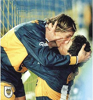 阿根廷人的豪放這一刻展現(xiàn)得淋漓盡致,主角是球王和風(fēng)之子。當(dāng)時風(fēng)之子接到球王的妙傳破門得分,兩個人當(dāng)場不顧全場所有觀眾和其他的隊(duì)友激吻在一起,長達(dá)6分鐘,而且還是“舌吻”!當(dāng)時引起了全世界的轟動!好戲還在后頭:卡尼吉亞的老婆說:“馬拉多納是同性戀,他喜歡親吻卡尼吉亞的嘴唇!碑(dāng)然老馬很生氣,但是他表示:“看在卡尼吉亞的份上就不追究了!”
